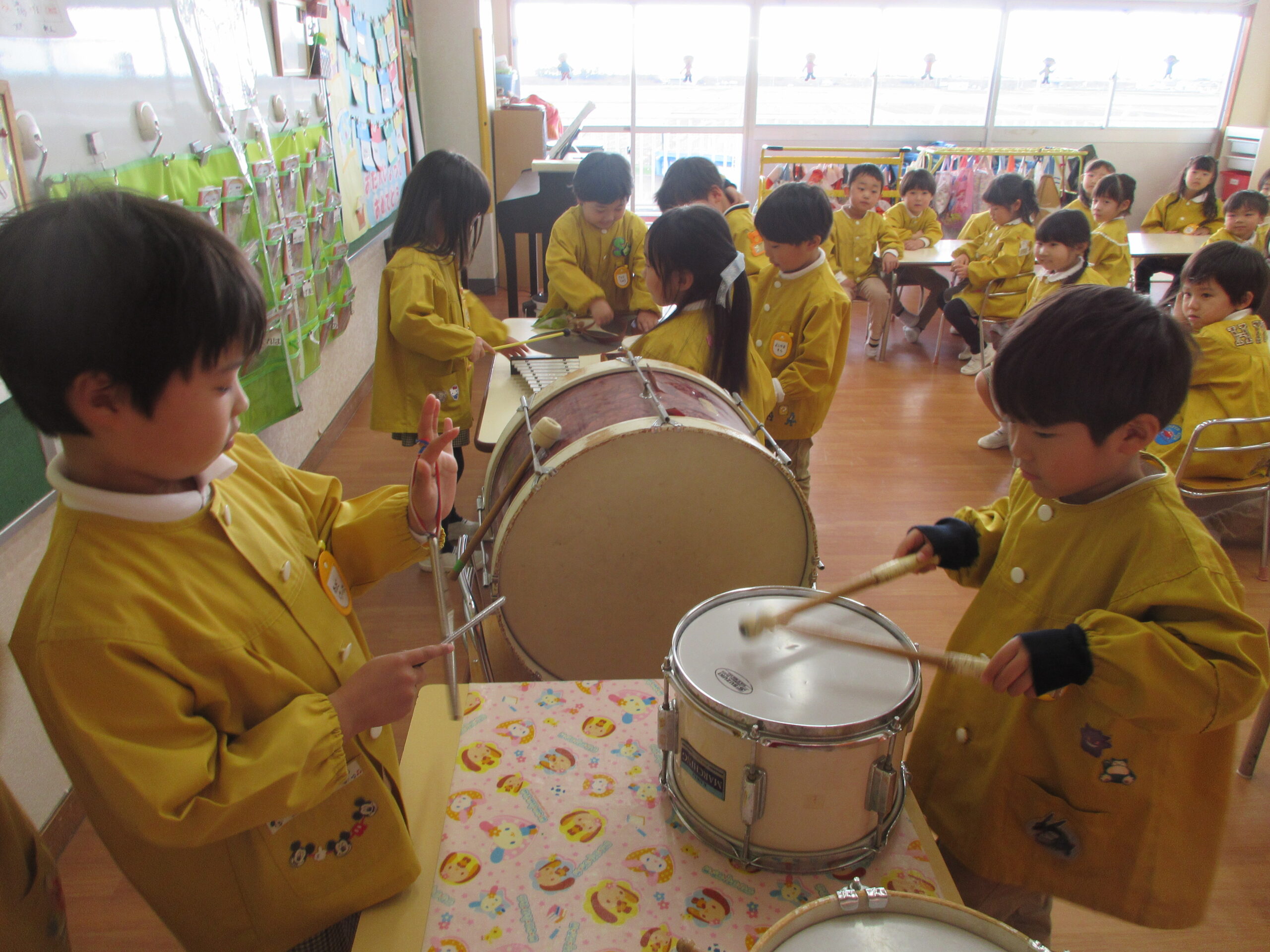 楽器遊びをしました♪太鼓や木琴・鉄琴、シンバル等々。それぞれの音の違いを楽しみながら鳴らしていましたよ。