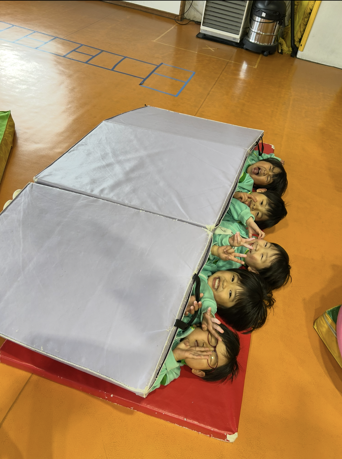 自由遊びの時間にプレイルームに行ったよ!みんなでマットに挟まって“れもん組サンドイッチ”の完成です♡