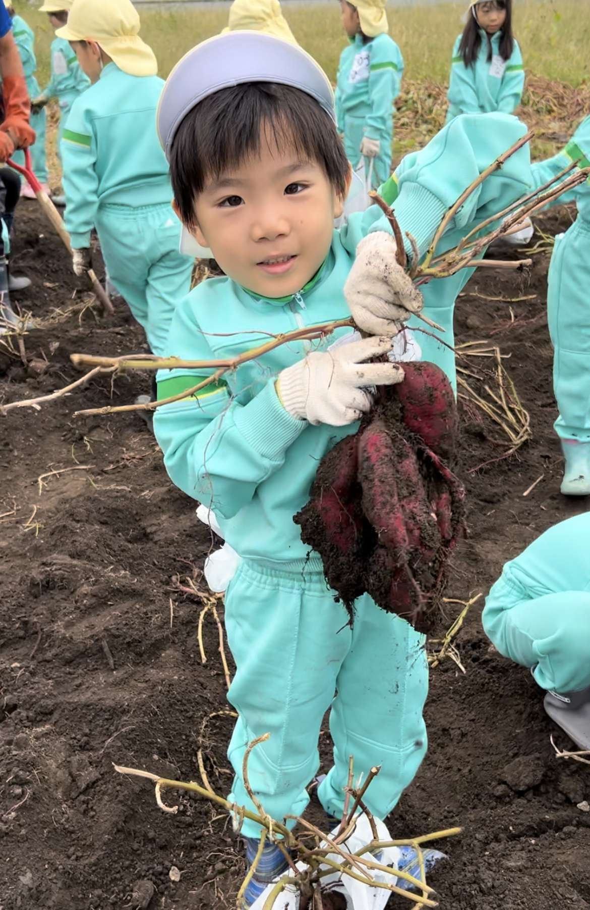 年長組が5月に植えたさつまいもを収穫しました!手で土を掘っていくと大きなさつまいもが何個も出てきて大興奮✨お気に入りの1つを袋に入れ、他の学年にも分けてお持ち帰りできました♡年長さんが育てたさつまいも、おいしかったかな?