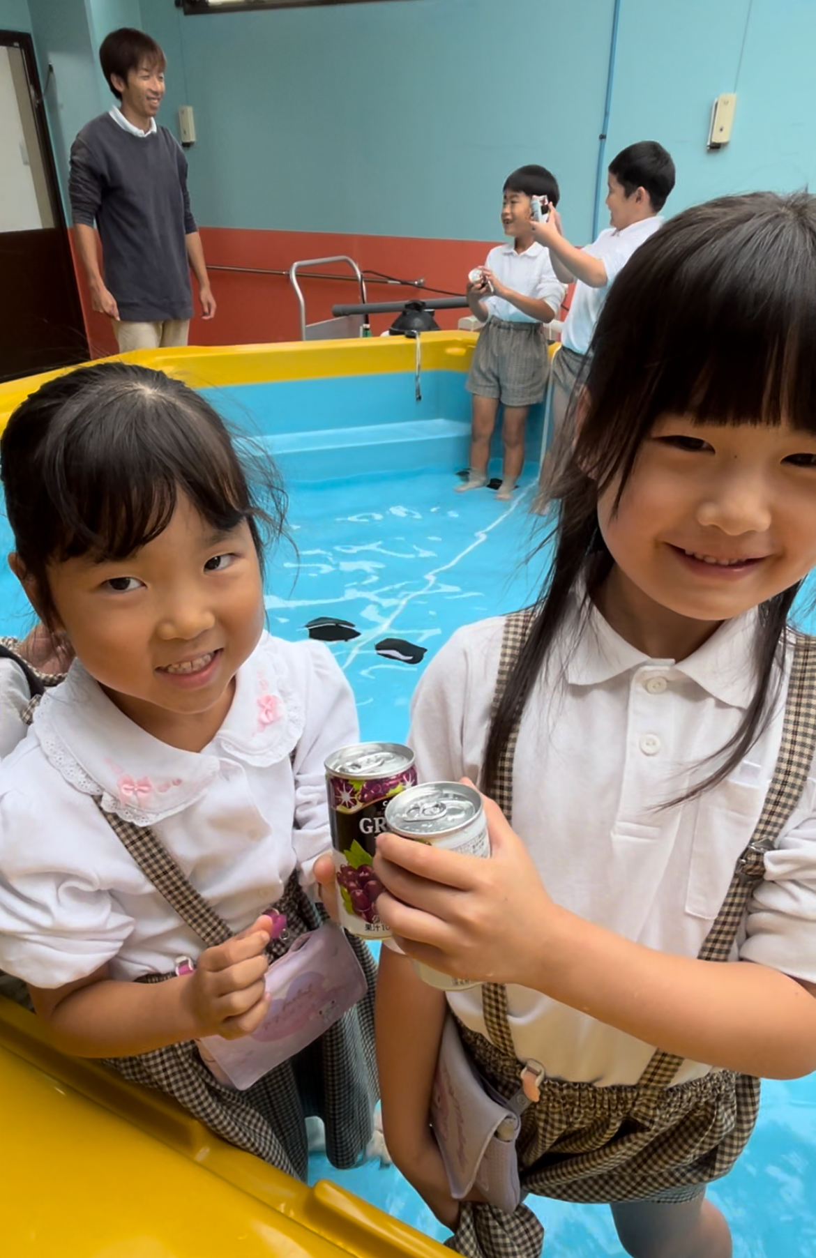 年長組がプール納会を行いました。少し肌寒い気候でしたが、裸足になりプールの中に沈んだ缶ジュースを皆、夢中で拾いましたよ☆彡給食時に、クラスのお友だちと乾杯しておいしそうに飲みました!幼稚園最後のプール、楽しかったね♪