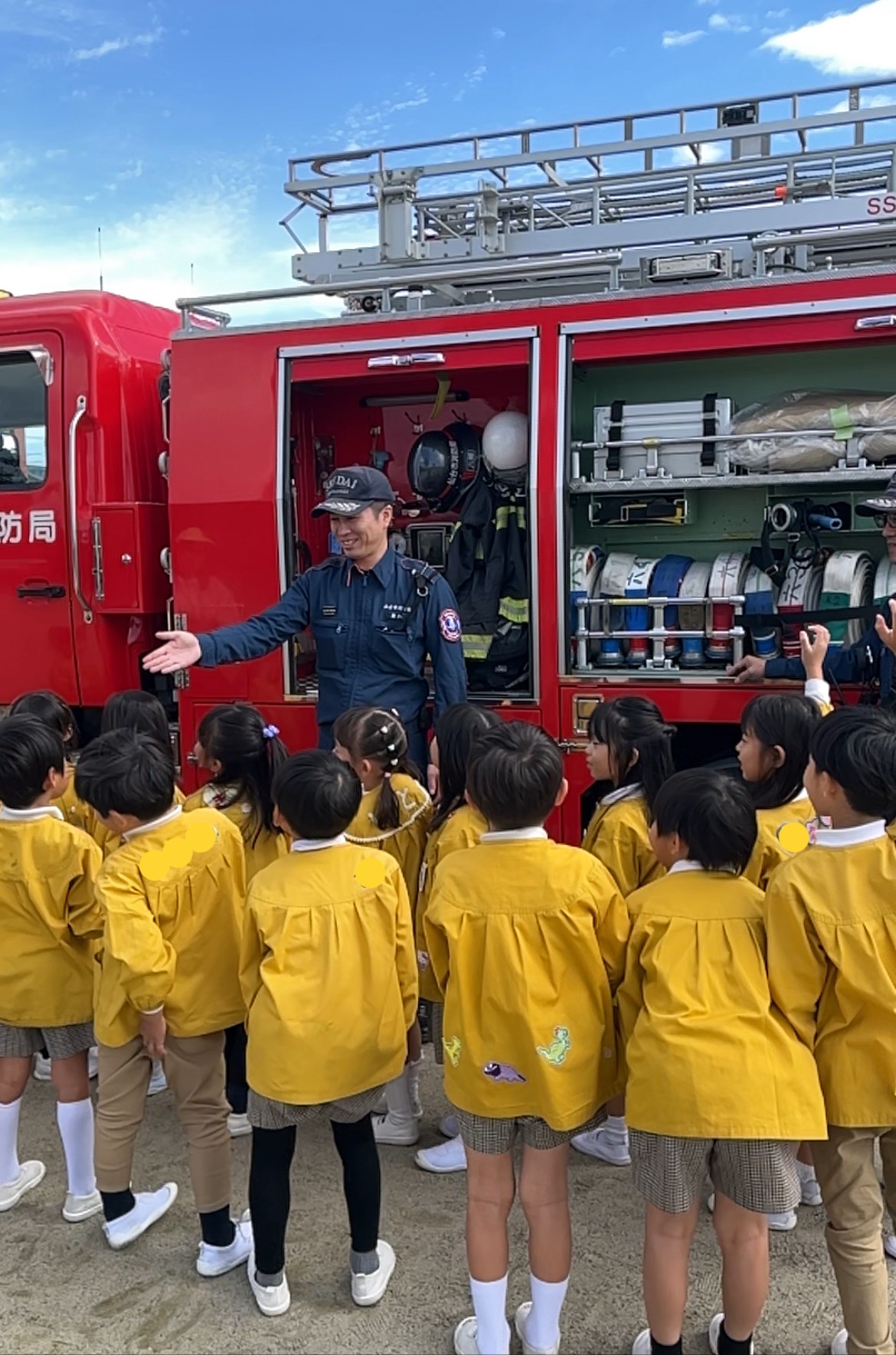 火事が起きたとき、どのように避難すれば良いか訓練をしました。皆ハンカチを鼻と口に当て、階段や非常滑り台から落ち着いて避難することができました。 訓練後は消防車の中を見学し、消防士さんからの説明を興味深く聞いていました。