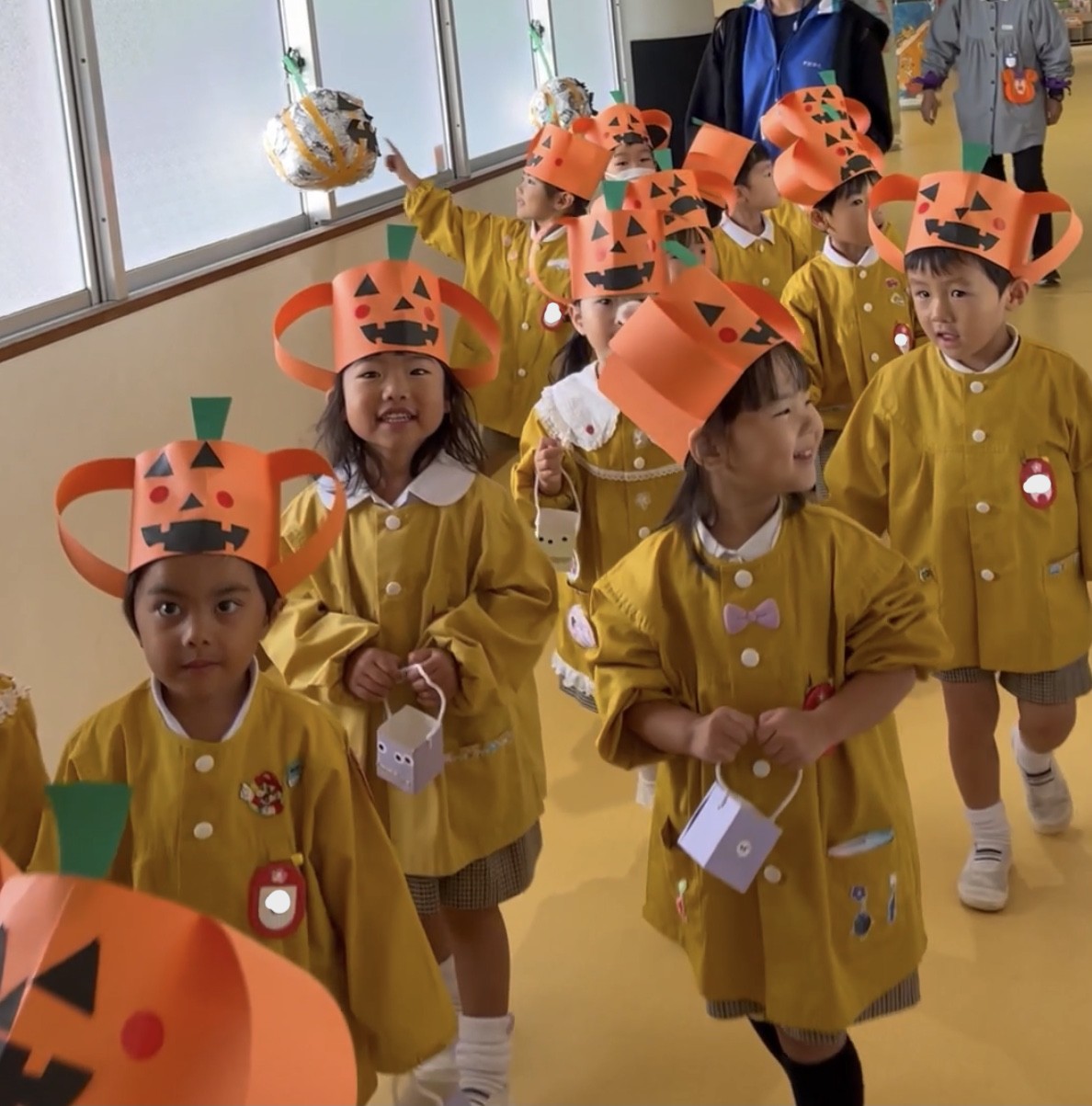年少組でハロウィンパーティを行いました☆彡自分たちで作ったかわいいかぼちゃの帽子をかぶって園内をまわり、大きな声で「トリックオアトリート‼」☆彡おばけが怖くて泣いてしまうお友だちも・・・。おばけや園長先生からお菓子をもらって、皆おいしく食べました☺