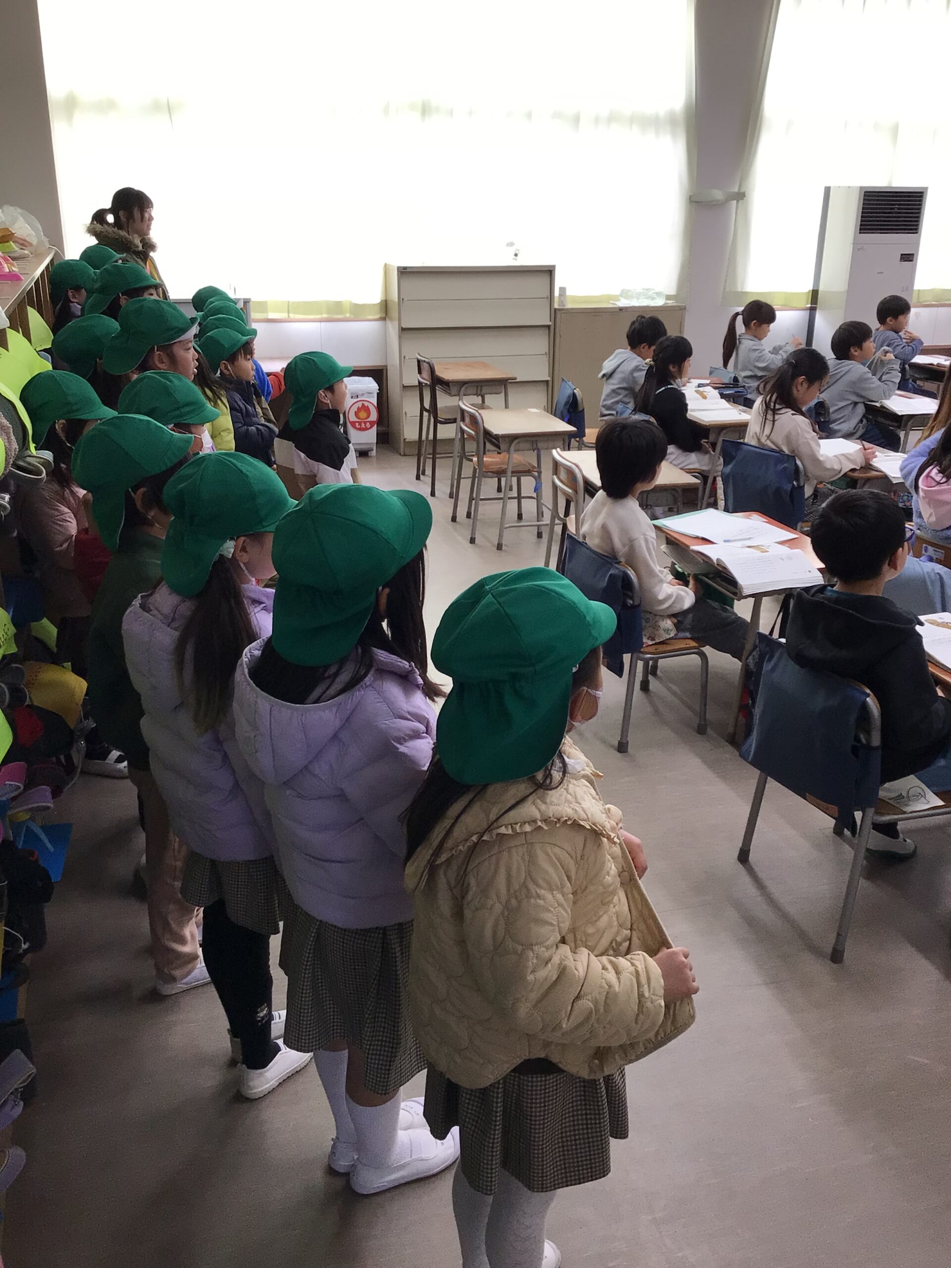 年長組が六郷小学校を訪問し、一年生の授業の様子を見学させてもらいました。国語、算数、図工など様々な授業を興味津々に見ていましたよ✨ 見学の後は教頭先生へたくさん質問をして、小学校への期待が高まったね♡