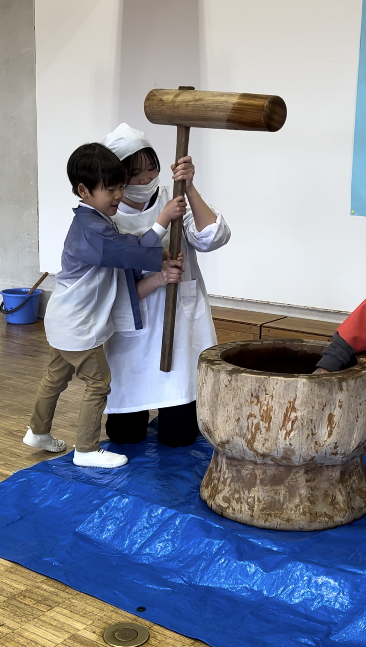 クラスで「もち」の本を読み、興味を持って迎えたもちつき会‼ ほかほかのもち米が少しずつもちになる様子に期待しながら職員のもちつきを応援しましたよ♡ その後は一人ずつ先生と杵を持って「よいしょー‼よいしょー‼」と力いっぱいもちつきをし、どのクラスも元気な声が響き渡っていましてた♪