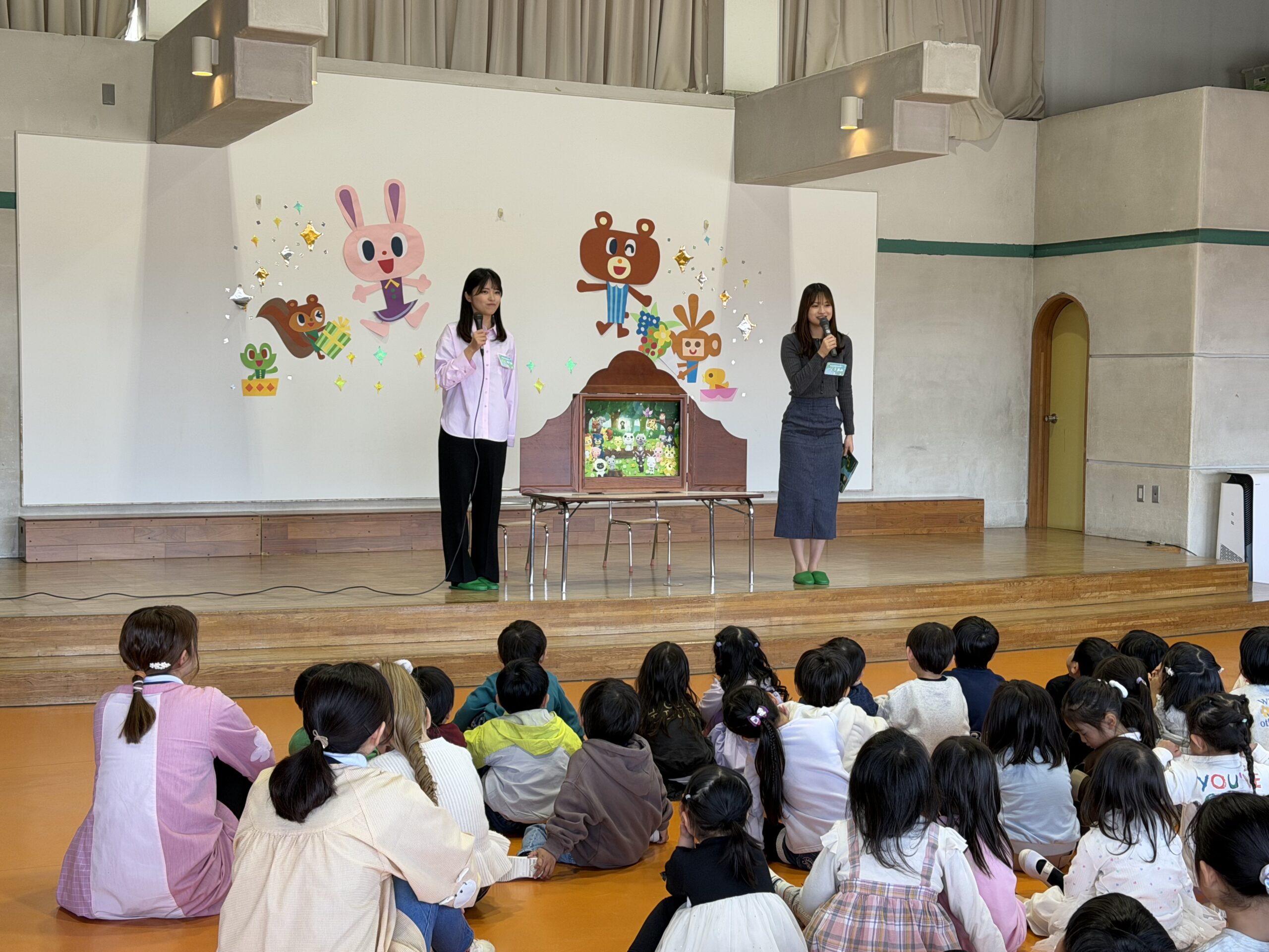 春休みの預かり保育中にKhbアナウンサーの方が紙芝居の読み聞かせに来てくれました。とてもきれいな声で皆、物語にひきこまれていましたよ♪ 読み聞かせの後はぐりりも登場し、ぐりりの秘密を教えてもらったり、1人ずつ触れ合うこともでき、笑顔がいっぱいの時間になりました。