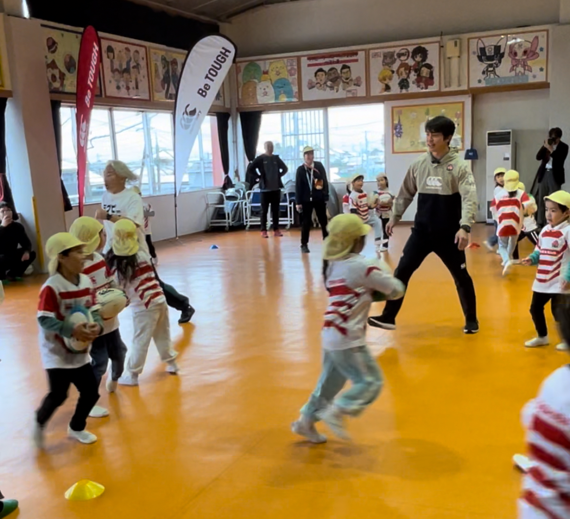 公益財団法人日本ラグビーフットボール協会の方が来て、ラグビー教室を開催してくださいました✨ 今回参加したのは年長組の47名!お借りしたユニフォームを着て準備体操をしたり、実際にラグビーボールを持って「トライ」のやり方を教えてもらったりしましたよ☆最後に1人1つずつ小さいラグビーボールをもらい大喜びの子ども達♪ 自由遊び時にもラグビーボールで楽しく遊んでいますよ♡