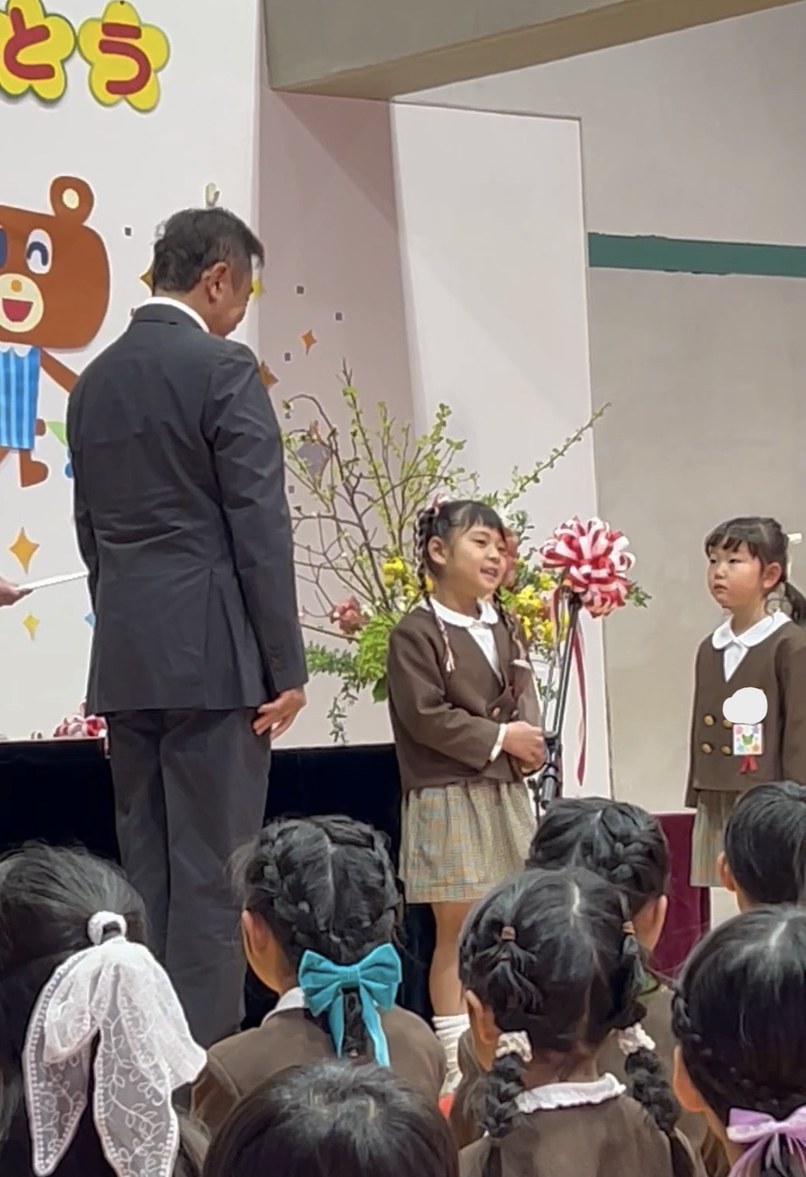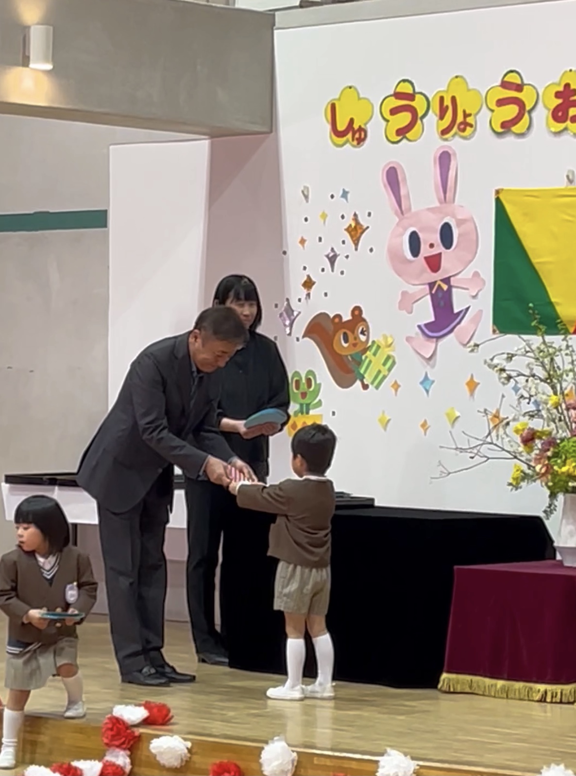 修了式を行いました。1年間頑張ったお友達に、園長先生から修了カードのプレゼントをもらいました!1年間で心も体も大きくなったね☺更にかっこ良いお兄さん、お姉さんになるように頑張ろう🚩
