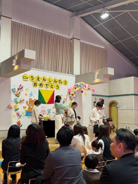 年少児が4月13日に入園進級式を行いました。おうちの人と一緒に入場した園児たち。最初は緊張した表情でしたがクラス毎集合写真撮影をするころには笑顔になっていましたよ☆!これから楽しい幼稚園生活を送ろうね♡